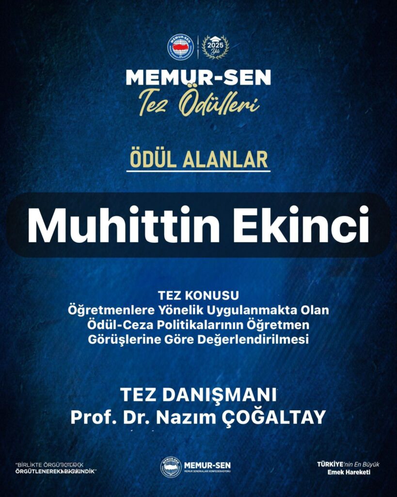 Ekinci, “Öğretmenlere Yönelik Uygulanan Ödül ve Ceza Politikalarının Öğretmen Görüşlerine Göre Değerlendirilmesi” başlıklı çalışmasıyla Memur-Sen Tez Ödülü’nü kazandı.